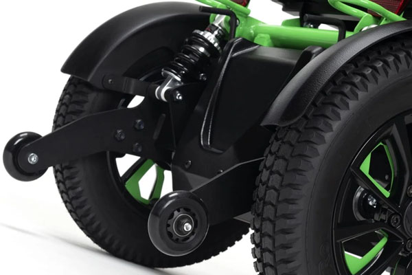 Include un sistem de frânare electromagnetic automat care se activează la eliberarea manetei de control, roți anti-răsturnare pentru stabilitate sporită pe pante și certificare oficială de testare la impact (ISO 7176-19) pentru utilizare ca scaun în autovehicule.